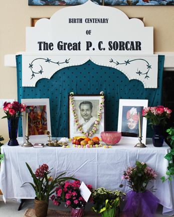 "The whole world knew him as The Great P. C. Sorcar, the legendary magician with sparkling Maharaja costume and plumed turban, " said Manick, "but in my eyes he was a totally different person. At home he always wore native Bengali clothes, a very simple and loving man - but a strict father - who always made sure we finished homework from school before we did any fun things. So, for today's occasion, I placed the picture of P. C. Sorcar the father in Indian clothes in the middle, surrounded by the portraits of the prince-charming Sorcar".