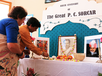 "I am immensely grateful to my father for being what I am today. Whatever I have accomplished is because of the hands-on experience I had with art and lighting at the back stage of his magic shows, and because of his inspiration and guidance", said Manick. The celebration continued till the end of the day. Manick and Shikha bowed down with their folded hands as they prayed for peace and sought blessings and ever-lasting love from the Great P. C. Sorcar. Note: Manick Sorcar's personal tribute - a letter to his father - was published in Anandabazar Patrika, India's most circulated newspaper based in Calcutta, Sorcar's home town and international head quarter.